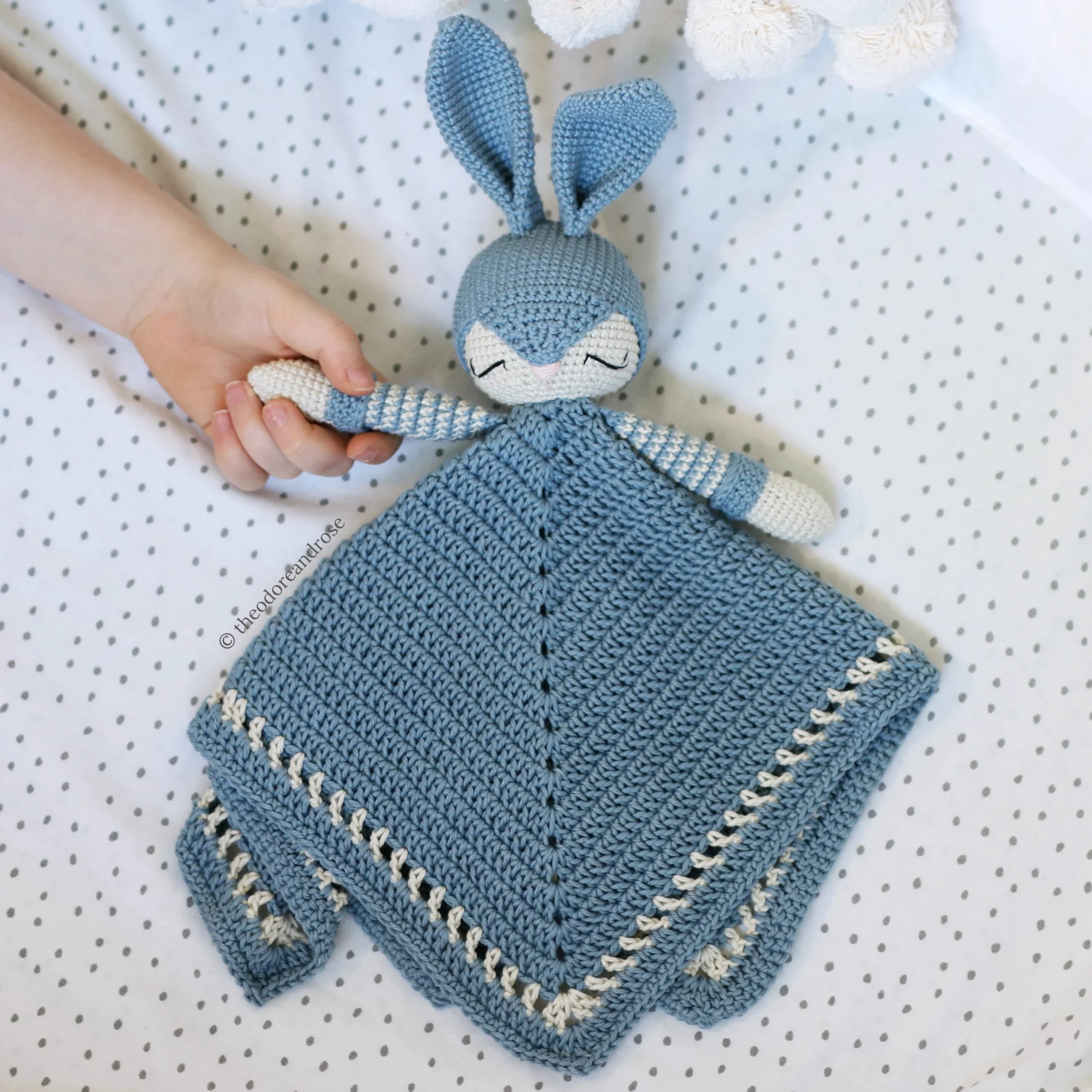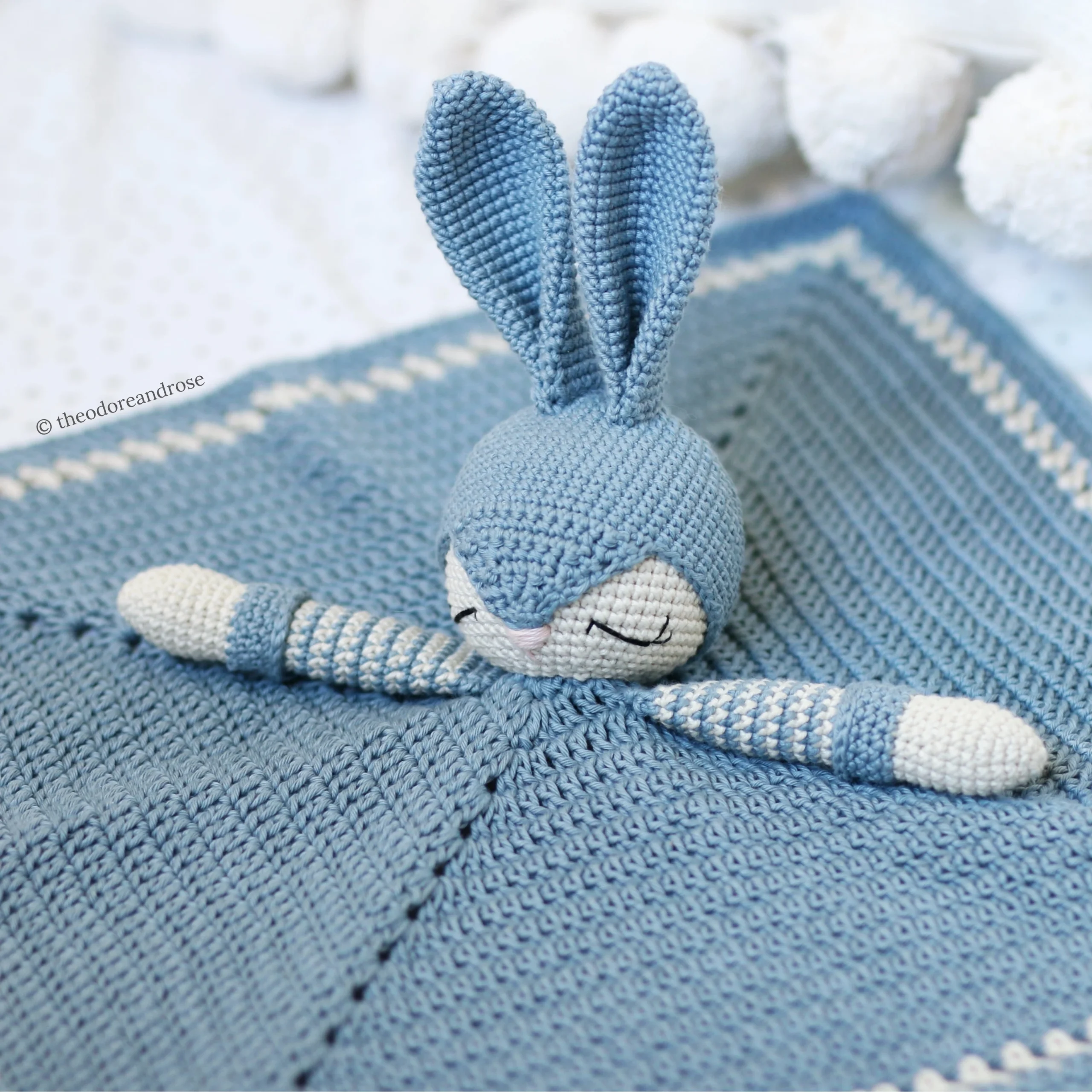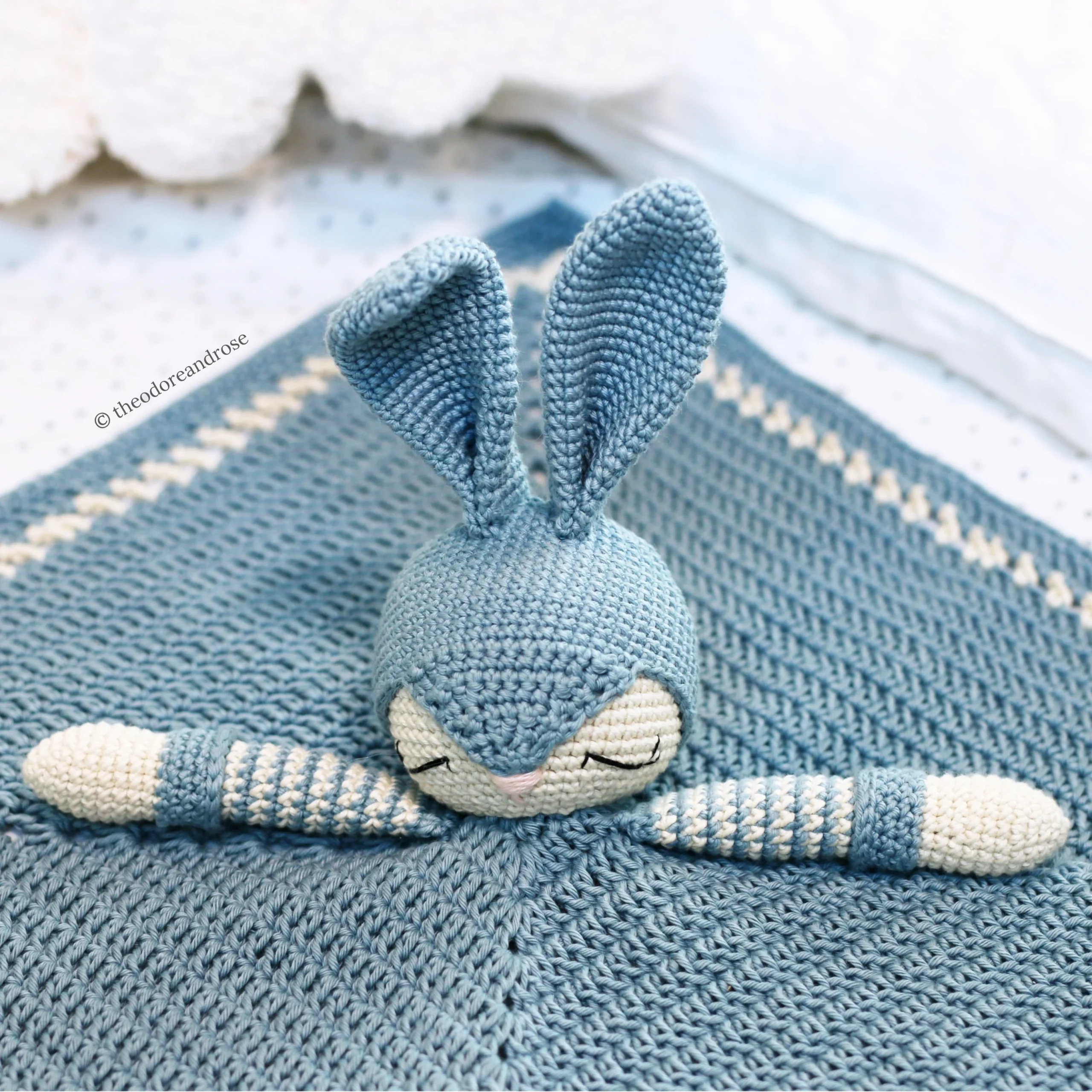 Briggs The Sleepy Bunny features an adorable bunny head attached to a simple square blanket worked in rounds, that is perfectly sized for little hands to snuggle.