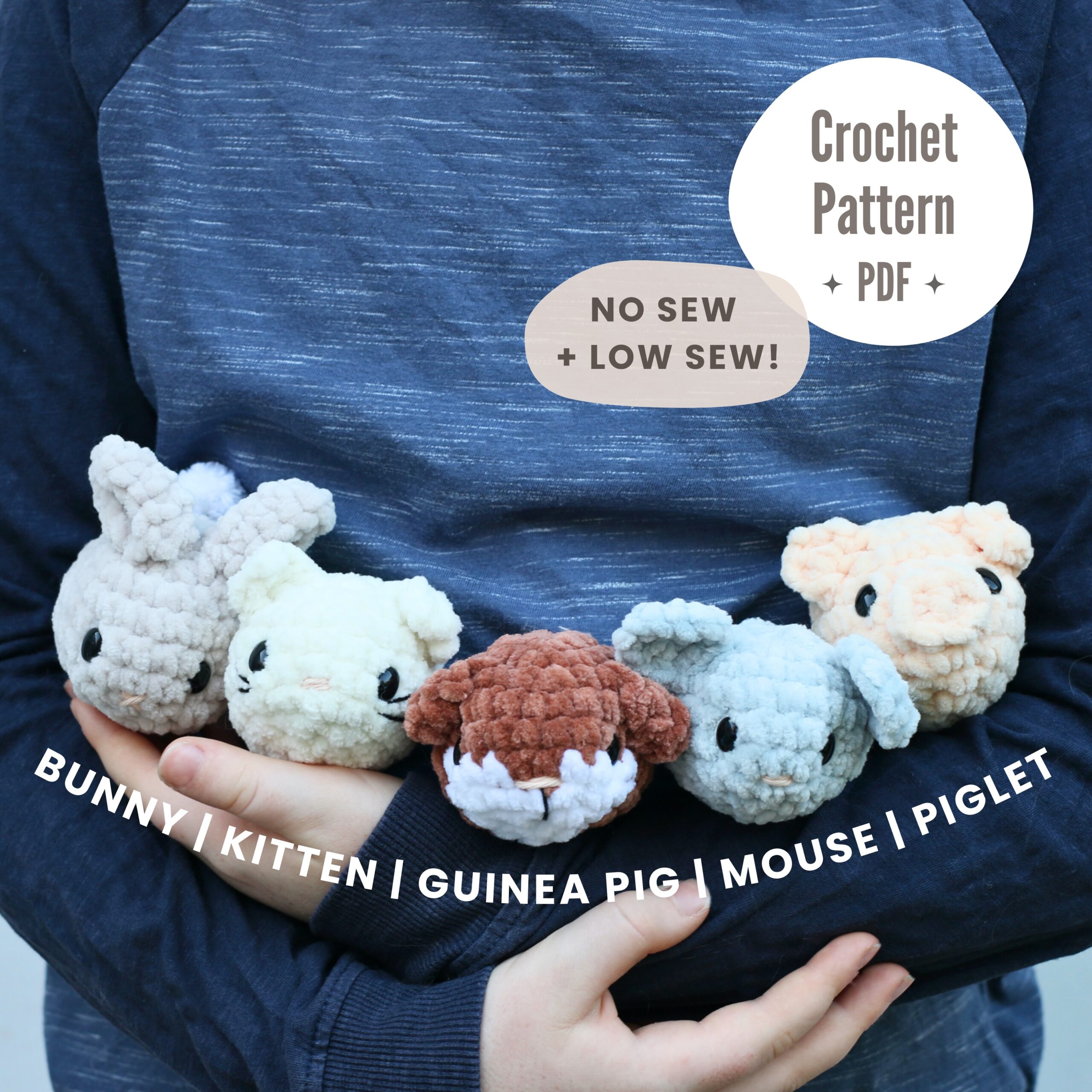Create your own set of adorable animal plushies with this beginner focused crochet pattern! Featuring five adorable designs – Bunny, Kitten, Guinea Pig, Mouse, and Piglet. These adorable Chubby Baby Animal Plushies use both no sew and low sew techniques making them quick to make and ideal for a stash-busting, market ready project.